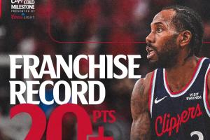 伦纳德连续45场比赛得分20+,超越鲍勃·麦卡杜独占快船队史第一。