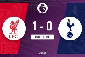 上半场伤停补时2分钟,半场结束,利物浦暂1-0热刺。