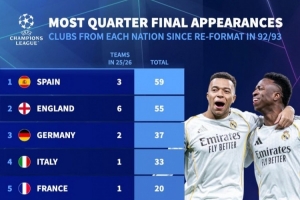 92-93赛季以来各国球队晋级欧冠8强次数: